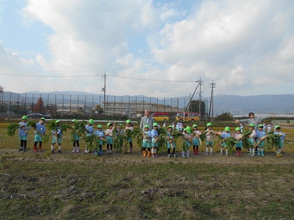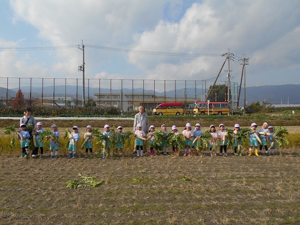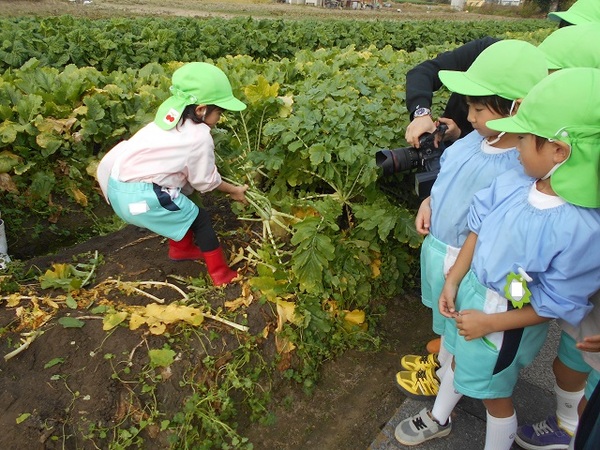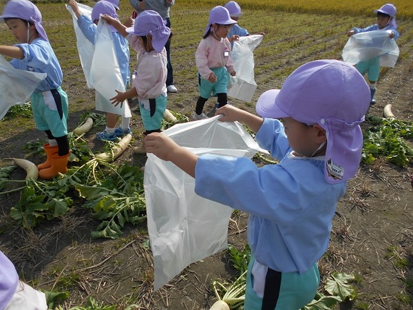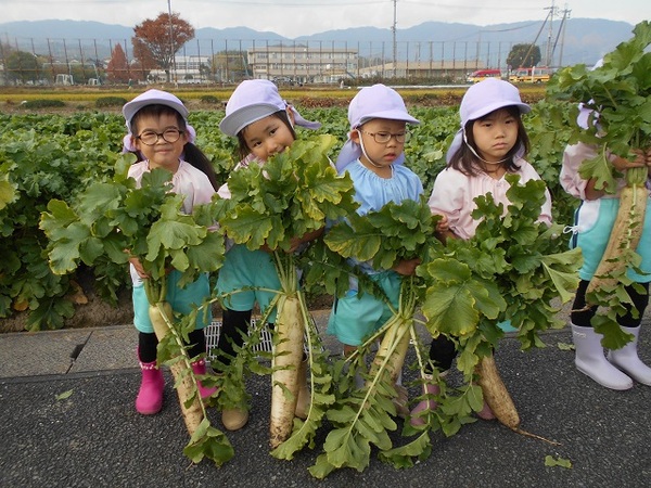 さくら組で大根抜きへいってきました!周りのお友だちに「がんばれ〜!」と応援してもらいながら一生懸命大根を抜いていました(^O^)重いと弱音を吐きながらも大事に大事に持っていました💛子どもたちが頑張って採った大根、お家で美味しく頂いてください☆彡 |