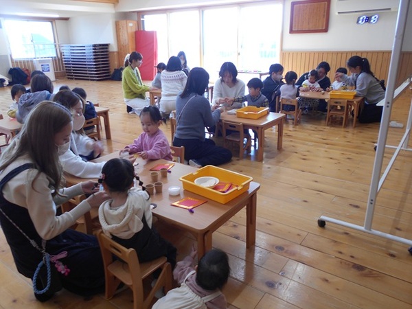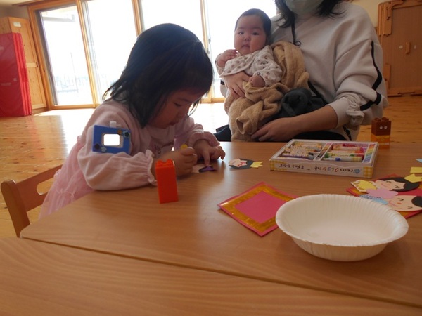 | 本日のすぎのこひろばは、まず、前回のバスでのドライブを思い出してふれあい遊びをしました。音楽に合わせてお家の人とノリノリで身体を動かしていてとても楽しそうでしたね♪ その後は、ホール横のひな人形を見てイメージを膨らませ、ひな人形製作をしました。真剣な表情でひな人形を見たり、お話を聞いたりする姿に、みんなの成長をぐっと感じましたよ!!自分の好きな着物を選び、顔を描いてオリジナルひな人形の出来上がり♡みんなが健康に過ごせるようにお家に飾ってくださいね☆ 次回は、2月26日(木)11時から文化芸術鑑賞会です。お誘い合わせの上、ぜひお越しください☆ |