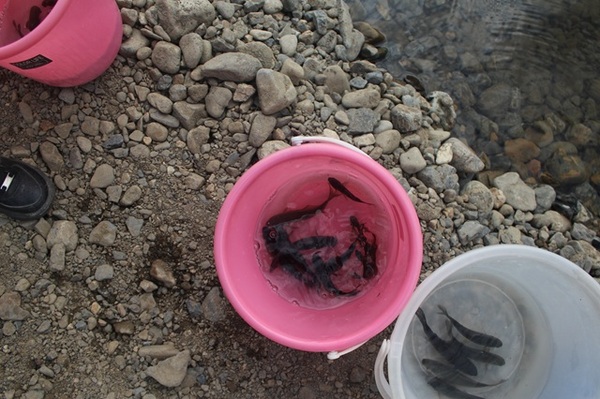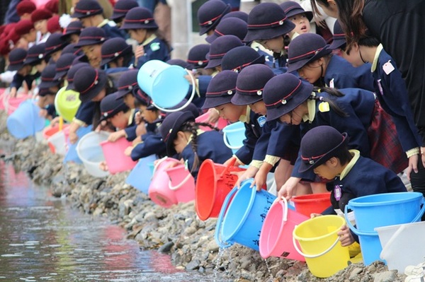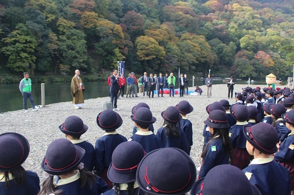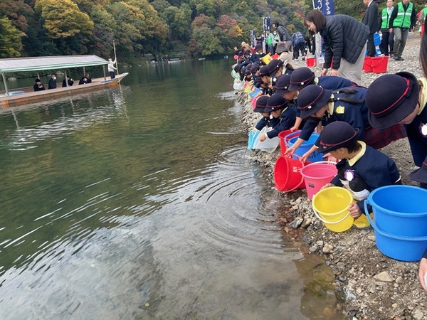 | 嵐山渡月橋上流で嵐峡の清流を守る会主催の幼魚放流事業に参加しました。京都府知事さんも来られて一緒に川岸より鮒の幼魚を放流しました。 幼魚が大きく育つように川をきれいにすることなど環境に関するお話を聞き、どうすれば川がきれいになるかを考えました。子どもたちにも生き物の大切さを改めて感じてもらえたと思います(^o^) |