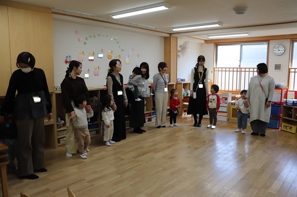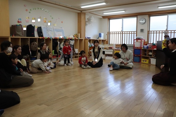 | 令和7年度親子参加のたんぽぽひろばが、2月25日で最終回を迎えました。6回の開催をすることが出来、回ごとの課題に合わせて取り組んできました。その中で保護者同士での子育て情報を共有しあったり、ワークショップを通してお母さん自身が楽しんで出来たりと、充実した時間になっておられたのではと思います。最初は皆さん緊張されておられた時間も、回を重ねるごとに自然と保護者同士の会話と笑顔が増えていっていたのがとても嬉しかったです。1年間のたんぽぽひろばで、保護者の方と過ごすことが出来たことはとても貴重で私たち担任にとって嬉しい時間でした☆ 1年間たくさんのご参加ありがとうございました☆ |