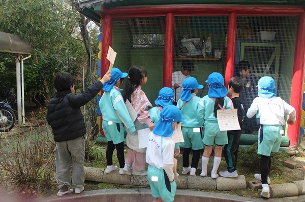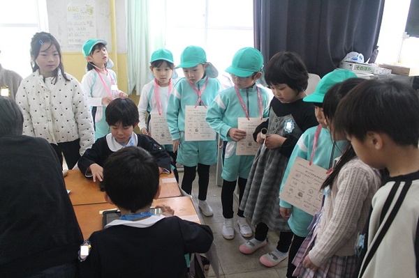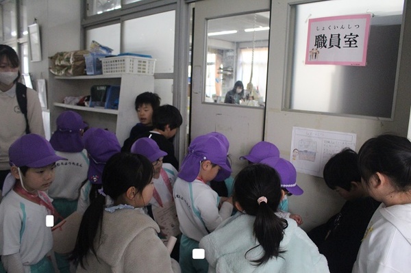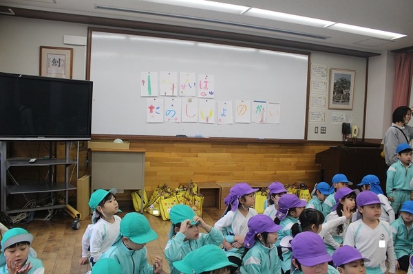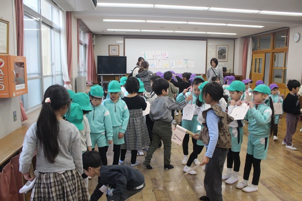 今日は架け橋プロジェクトの一環で松尾小学校へ学校探検に行ってきました!近隣の3カ園の年長組が集まり1年生に校内を案内してもらいました。職員室や音楽室、教室でいろいろな体験をしたり、学校で飼育されているウサギのお世話をしているところを見せてもらえて入学をさらに楽しみにする子どもたちでした。行き帰りの道でもお散歩気分で楽しかったです(^^)/ |
