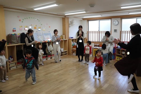 | 1月30日は待ちに待ったたんぽぽ教室1・2組合同のお楽しみ会でした。 2学期頃から歌い始めた歌や手遊び、お遊戯やリズム遊びを幼稚園のホールの舞台の上で披露しました。 緊張して、固まっちゃうかな?等、保護者の心配をよそに普段通りニコニコ笑顔で発表をする事が出来ていました。 1人ずつお返事をする姿がとても可愛くて、保護者の皆様はもちろん、先生たちも子どもたちの成長と頑張りに胸が熱くなりました。 最後は今までのたんぽぽ教室での過ごし方が見られるスライドショーで子どもたちの楽しそうに過ごす姿をご覧いただけて、また安心して頂けたら幸いです☆ 本日はお忙しい中ありがとうございました。 |