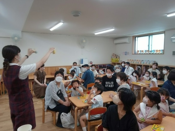| まだ小さなたんぽぽ組さんには1粒だけでもお口の中いっぱいになり頬張っていましたね♪たくさん食べた後は少し坂道を登って、急な階段を踏ん張ってあがり、京都市が一望できる展望台へ。汗をかいて登り切った後に広がる景色はとっても爽快でした。それでも残暑はまだまだ厳しく日差しもきつかったので急遽幼稚園に戻り、幼稚園のホールでピクニック!みんなで食べるご飯は美味しかったですね♪お腹いっぱいになった後は親子ダンスを楽しみこの日は解散となりました。お暑い中でしたがたくさんの方のご参加ありがとうございました。また蜜を避けるため現地集合現地解散にご協力くださった方、ありがとうございました♪