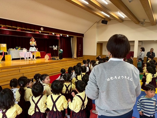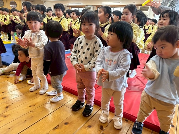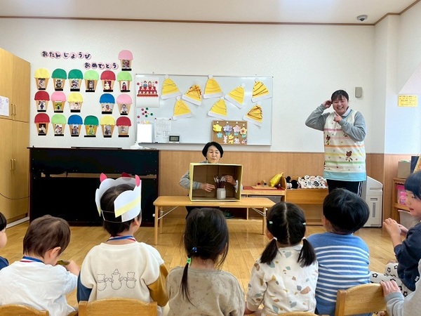 | 今日は2月のお誕生日会でした✨今月は2人のお友だちがいましたよ! 少し緊張した様子で前に登場していた子ども達でしたが、名前や質問などは上手に答えてくれました☻ 出し物では、「箱の中身はなんだろなゲーム」をしました!保育者が箱に手を入れて、触った感触で箱に入っている物を当てるゲームで、子ども達にはヒントを出してもらいました。絵の具の筆を見て、「保育園で使うやつ!」「ぬりぬりするものだよ!」など、普段使っている事を思い出しながら、一生懸命伝えてくれました!はじめは、物の名前を言わない様に気を付けていた子ども達ですが、ゲームが進むにつれて名前を言ってしまい、「言ったらダメだよ!」や、「言っちゃった!」と様々な反応を見せてくれた姿がとても可愛かったです💗 今月も楽しい誕生日会になりましたね☻ 2月生まれのお友だち、お誕生日おめでとう🎉 |
