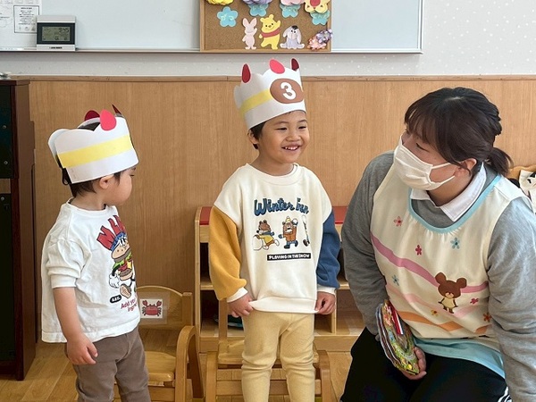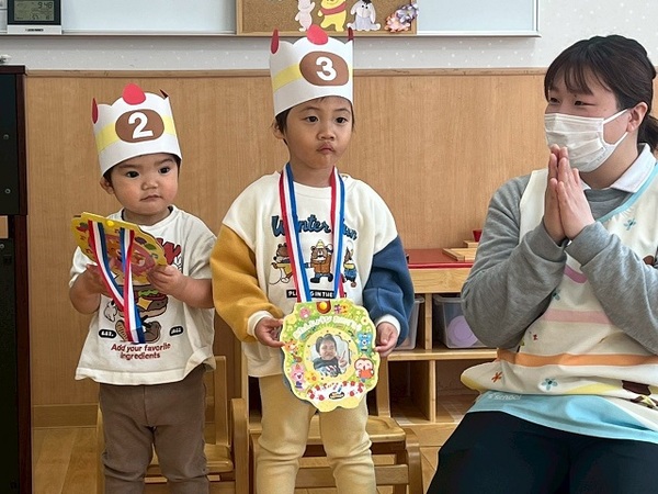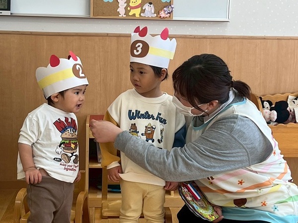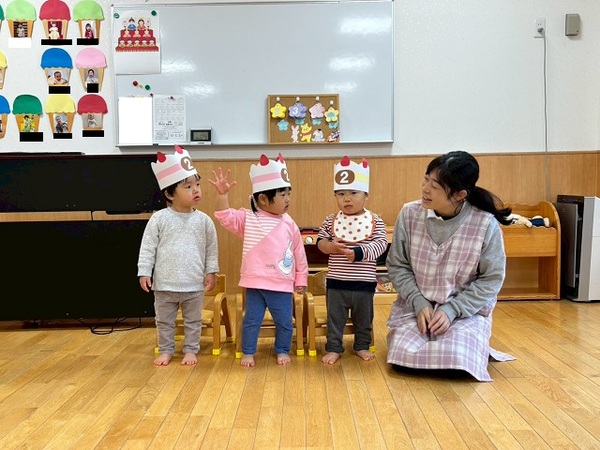 | 今日は1月のお誕生日会でした! 今月は2名のお友だちがお誕生日を迎えました☆ みんなで歌を歌ったり、拍手でお祝いしましたよ♪ 保育士からの出し物は『雪だるまの福笑い』でした⛄ 目隠しをした保育士が雪だるまの顔のパーツや手を貼るのを、子どもたちが「もっと上!」「下だよ!」と応援してくれましたよ!! おかげでとっても可愛らしい雪だるまが完成しました♡ 1月生まれのお友だち、お誕生日おめでとう(*^-^*) |