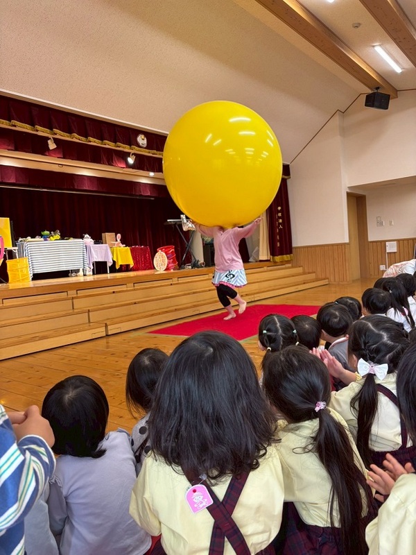 | 今日は文化芸術鑑賞会がありました! バルーンアートや、音楽を使った出し物を見せてもらいましたよ✨ バルーンで作った動物を見て、「パンダ!」と言ったり、知ってる曲があると、「○○の曲だ!」と元気に答えてくれました! 他にも、音楽に合わせて踊ったり、「パンダ・ウサギ・コアラ」の手遊びをしたりと、楽しく遊ぶ事が出来ましたよ☻ 途中に出てきた技に、驚いてしまう子ども達もいましたが、その後はまた楽しい音楽が流れ、ニコニコ笑顔の子ども達でした💗 作ったバルーンアートを1つ貰い、お部屋に飾りました! とても楽しい時間になりましたね☻ |