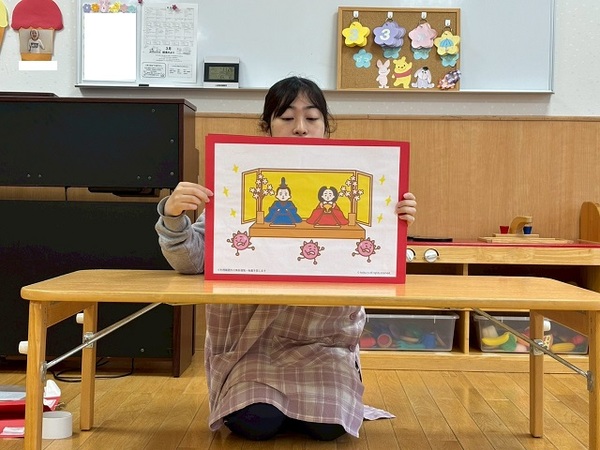 | 今日は幼稚園と保育園での作品展がありました! 前日から準備をしている先生たちをみて、「何してるの?」と気になっていたお友だちが多く、楽しみに待っていてくれました! 子ども達の写真が貼ってある作品展の看板は、子ども達もお気に入りで完成した後はしばらくの間、「あそこに○○ちゃんがいる!」「これ○○君だ!」と貼ってある自分の顔や、お友だちの顔を見て嬉しそうにしていました☻ 幼稚園のお友だちの作品も見に行き、消防車やお魚、どんぐりなど、知っている物が描かれている絵を見て、「すごーい!」や「あっちにも同じ絵があるよ!」とお話してくれましたよ。 最後は気になっていたホールに行き、様々な立体作品が置いてあるのを見て、興味津々な子ども達でした。大きなバスや、下の園庭にある遊具を作ってあり、ハンドルをもって運転してみたり、「これ、下の園庭のすべり台だ!」と嬉しそうに話したり、様々な反応を見せてくれました✨ こばと園では、ひな人形の製作と思い出製作を飾らせて頂きました。とってもかわいいのが出来ましたね💗 |